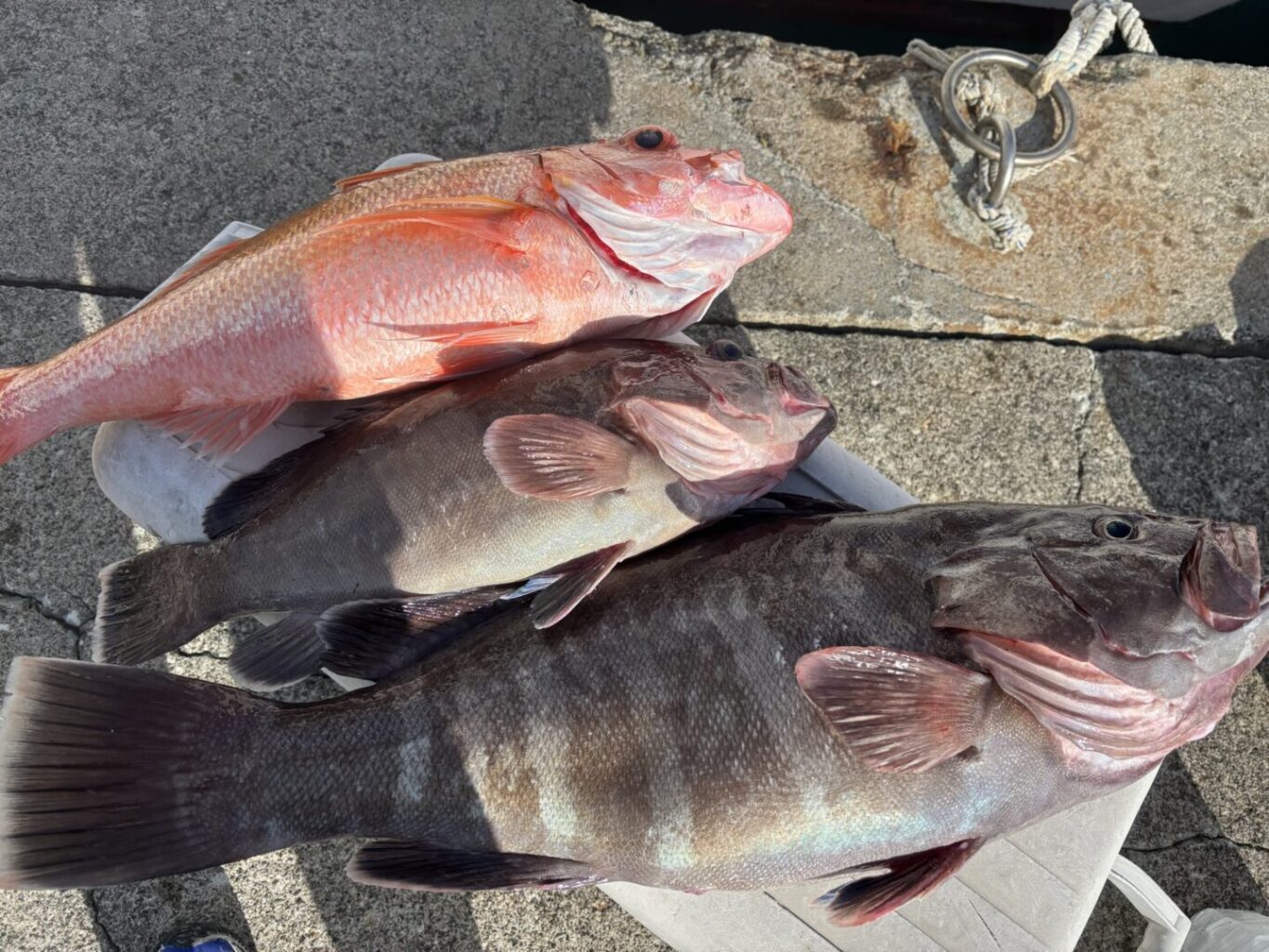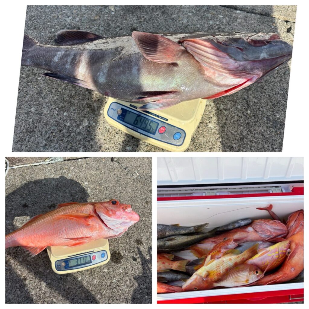 釣果情報 12/10(水) 投稿日: 2025年12月10日2025年12月10日 captain 久しぶりに良い凪でした🎣 マハタ2.3㌔&6.4㌔2本他オオグチハマダイ、ムツ、カンコ、アカヤガラ、アヤメカサゴ等 当たり少ない中大型マハタゲット^_^