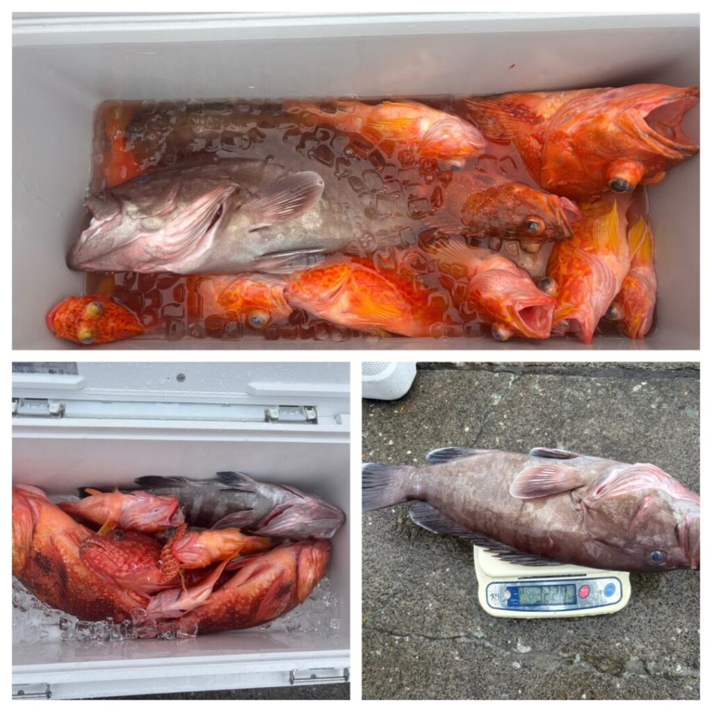 マハタ1.2㌔&3.2㌔2本バラし有り。他カンコ、鬼カサゴ、アヤメカサゴ等